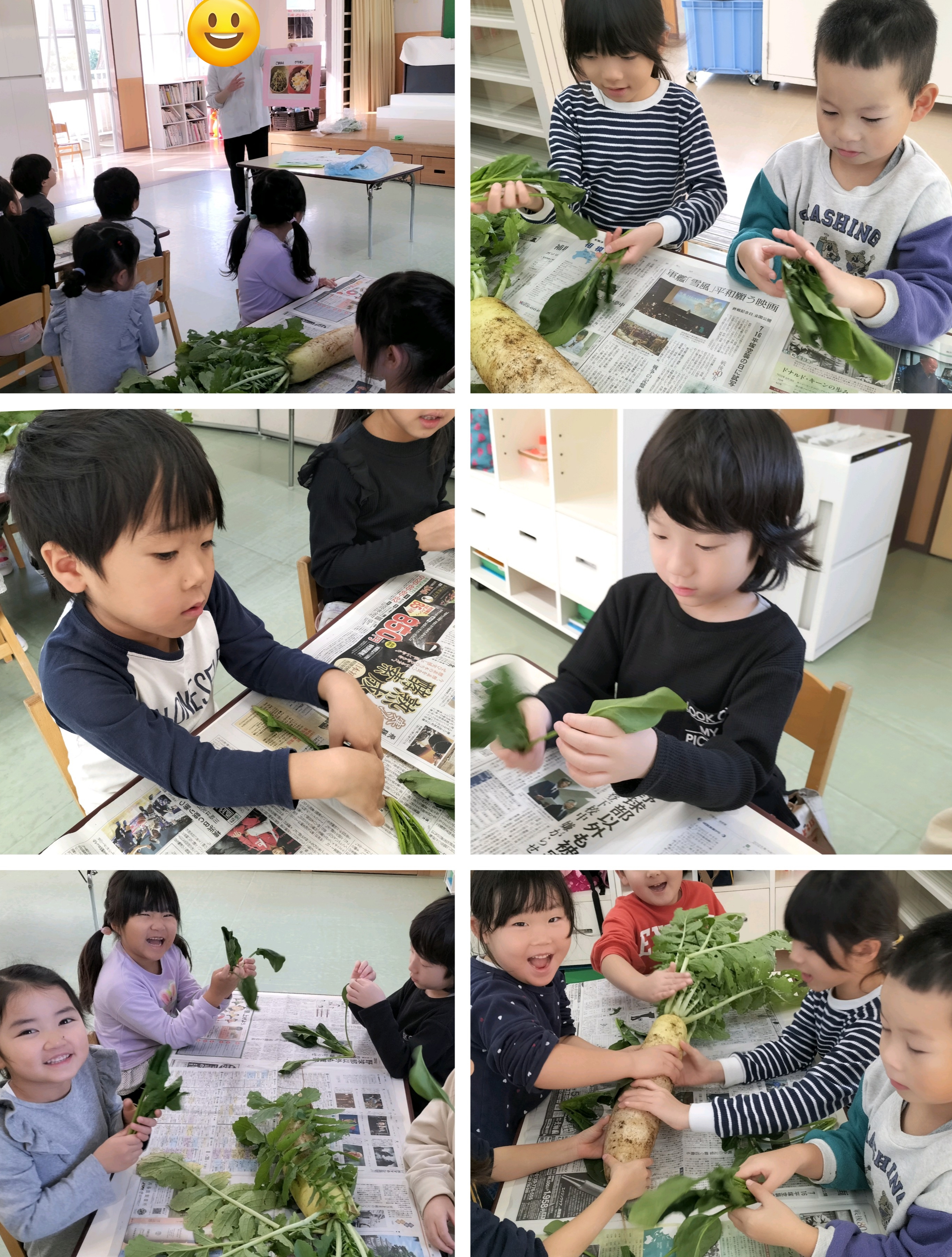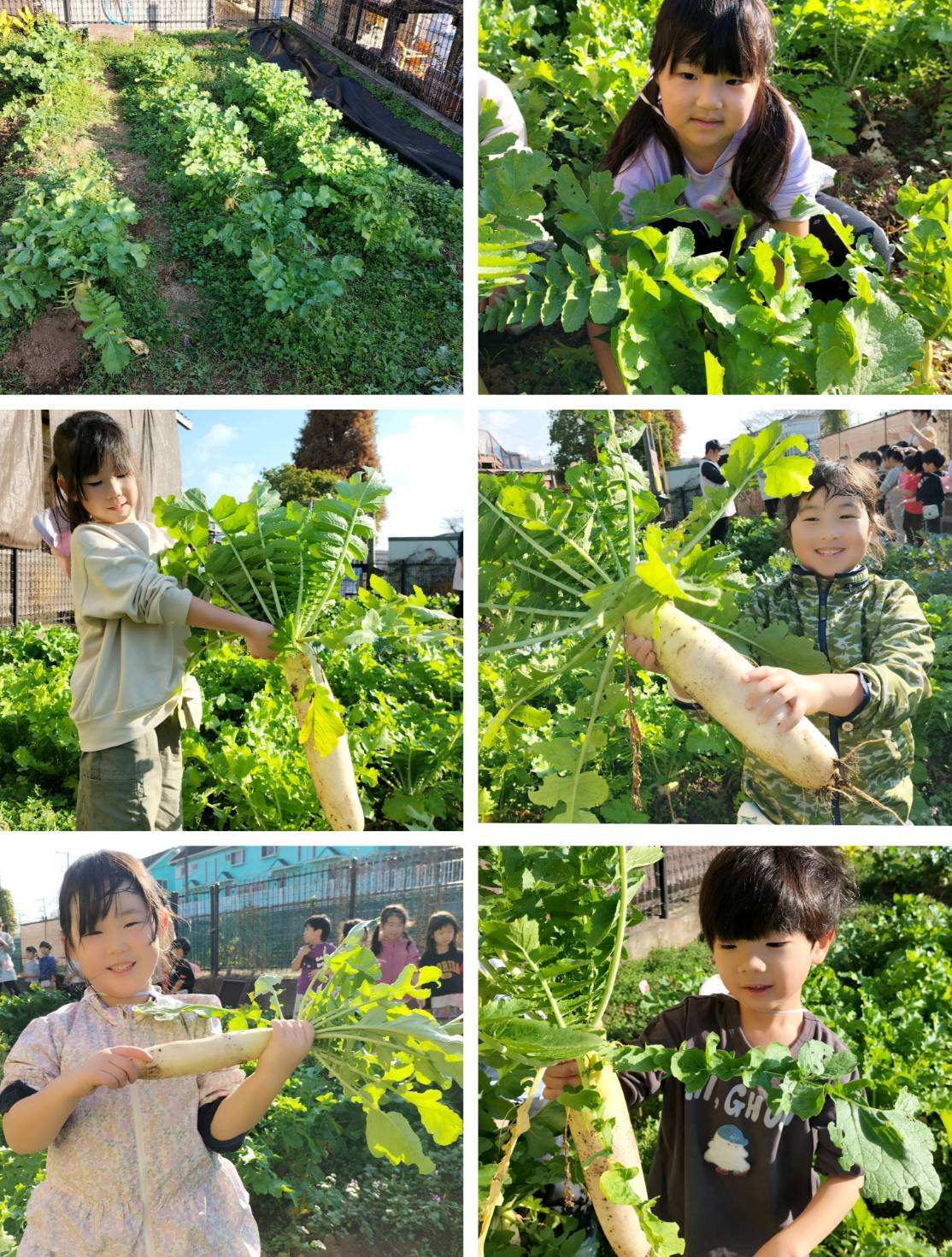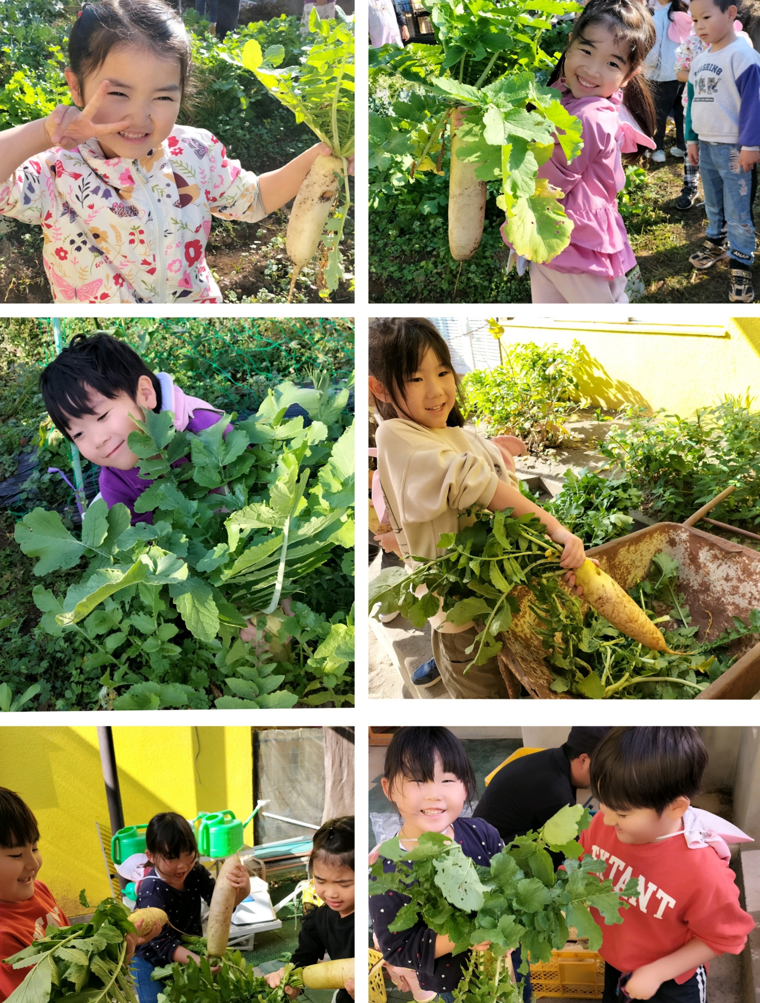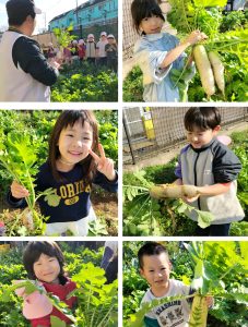 園では初めて見る大根畑に「わぁー、こんなにいっぱいある。」と目をキラキラさせる子どもたち。葉の付け根を持ち、真っ直ぐ抜くコツを教わりいざ収穫。太くて大きな大根を掘る子。細くて小さな赤ちゃん大根を掘る子。·····と大きさは様々でしたが楽しく収穫することが出来ました。