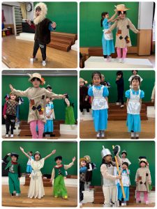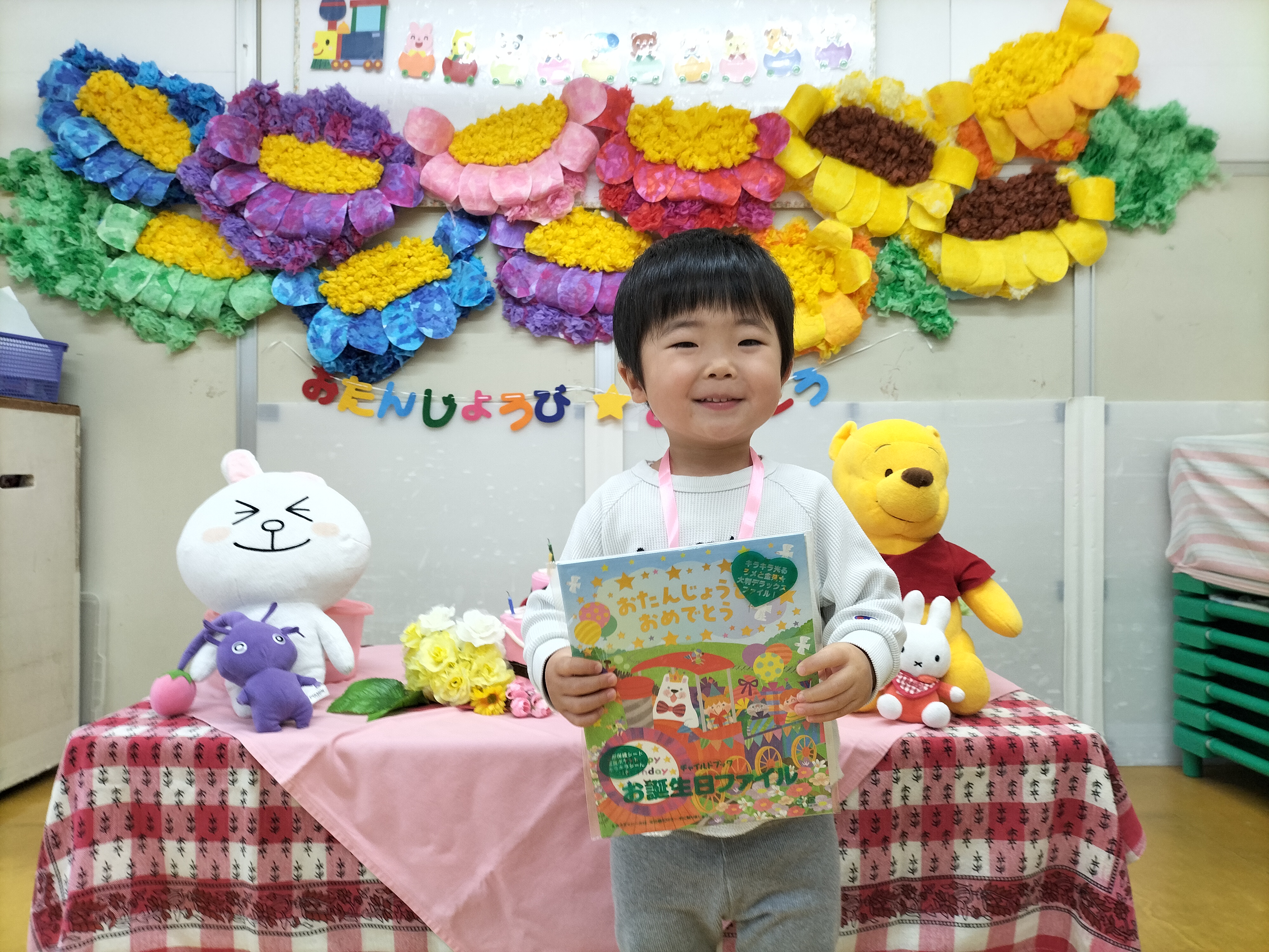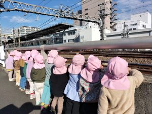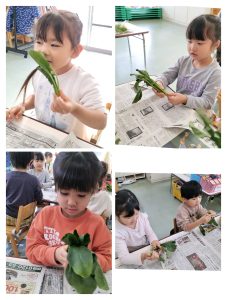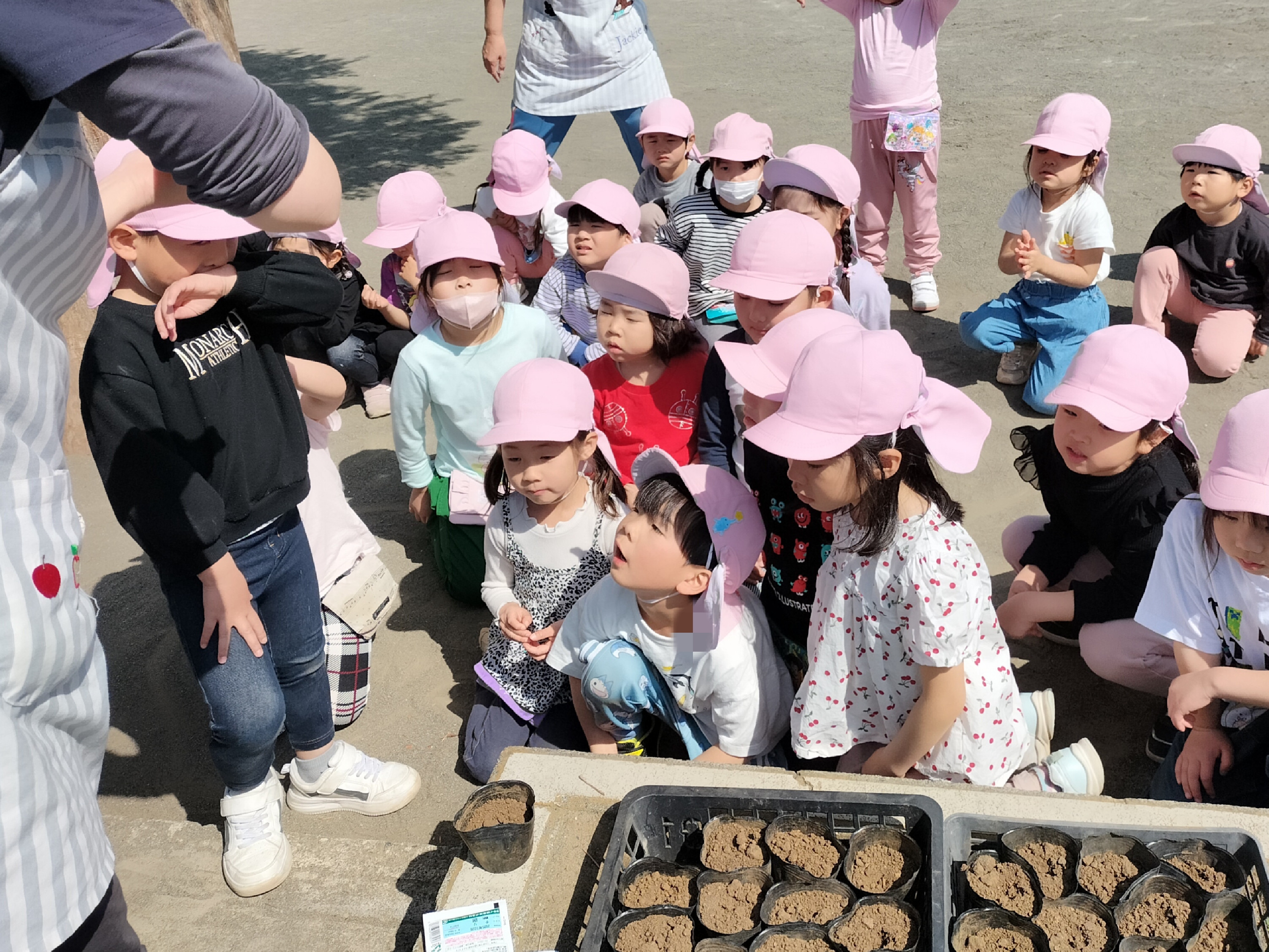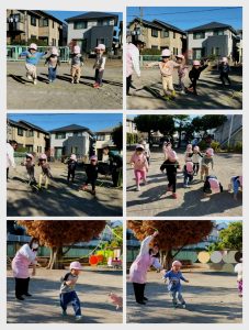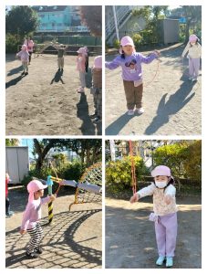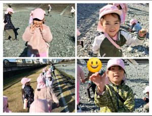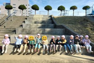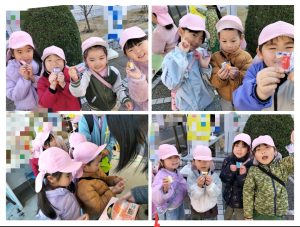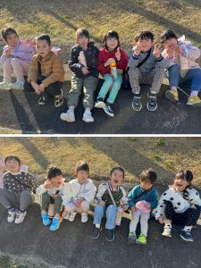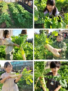 園では初めて見る大根畑に「わぁー、こんなにいっぱいある。」と目をキラキラさせる子どもたち。葉の付け根を持ち、真っ直ぐ抜くコツを教わりいざ収穫。太くて大きな大根を掘る子。細くて小さな赤ちゃん大根を掘る子。·····と大きさは様々でしたが楽しく収穫することが出来ました。
