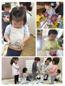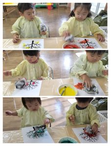 新聞紙遊びで新聞紙をみんなで丸めて、その後、丸めた新聞紙に絵の具をつけて、木の描いてある紙にスタンピングして、紅葉を表現しました!