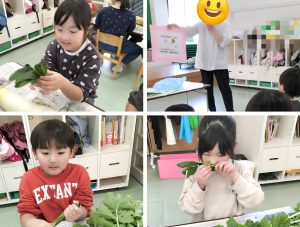 両方とも今の時季、甘みや栄養がアップするので是非食べてもらいたい食材とのこと。今日の給食(魚の蒸し焼き)に、ほうれん草が入っていて美味しく食べていましたよ。