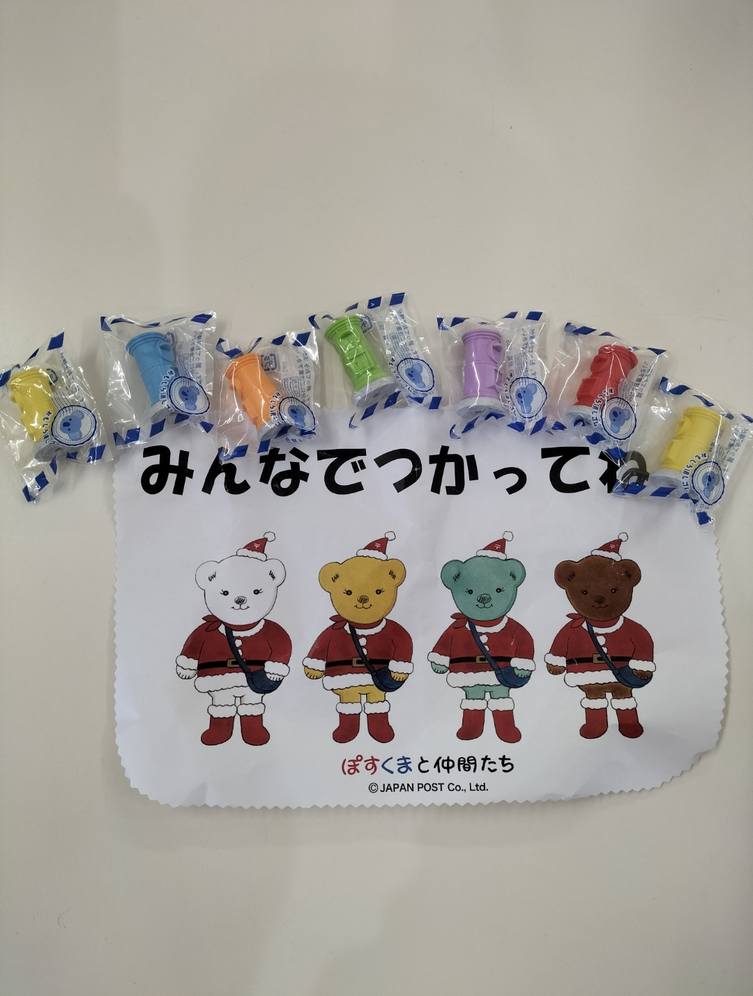 以前郵便局の方から郵便局のキャラクターポスくまが描かれた塗り絵が届き、みんなで塗りました!