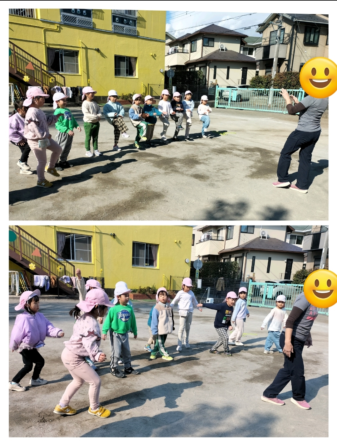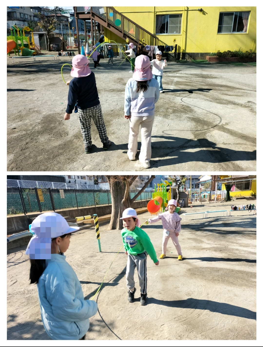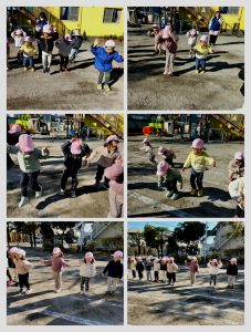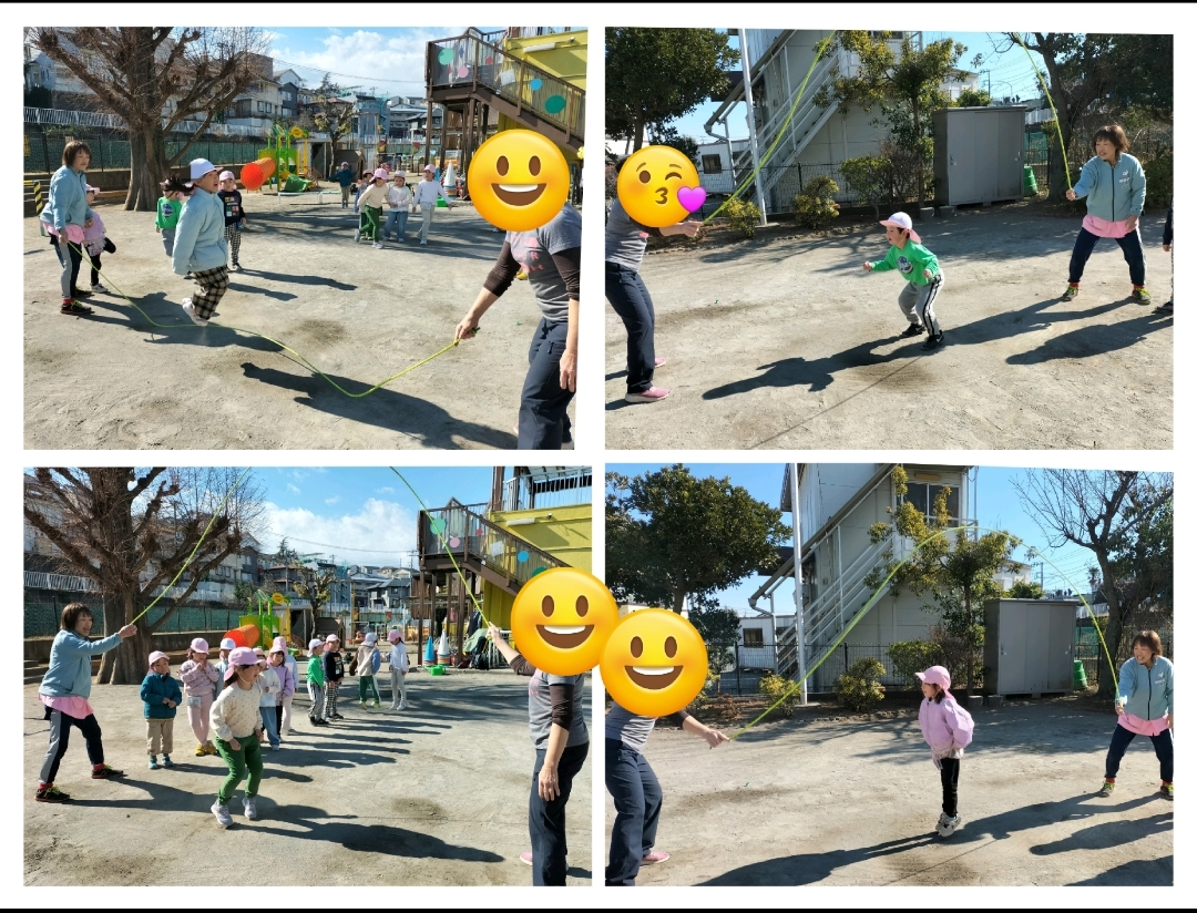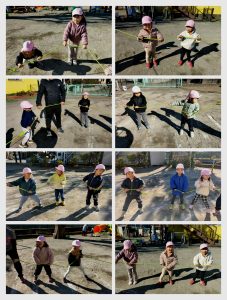 いつもは保育者が縄を回していますが、今日は縄を回すことも子ども達がやってみました✨️“かぶり縄”“むかえ縄”と回し方にも違いがあることなどを知ったり、簡単に見える回しも自分たちでやってみるとぐにゃぐにゃしてしまったり、スピードが速かったり…気持ちを合わせること、縄に入る人への思いやりを持つことを意識してやることができました😊