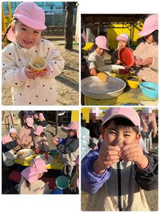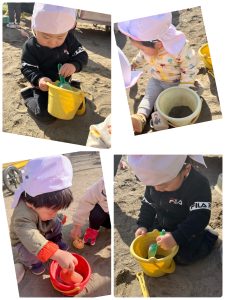 園庭で遊びました。いつものように、シャベルを持って、バケツに砂を入れていた子どもたち。保育士が中に入っている砂をシャベルで「グルグル」とかき混ぜると、子どもたちも真似をしてグルグルと混ぜ始めました!新しい遊びを発見しました!