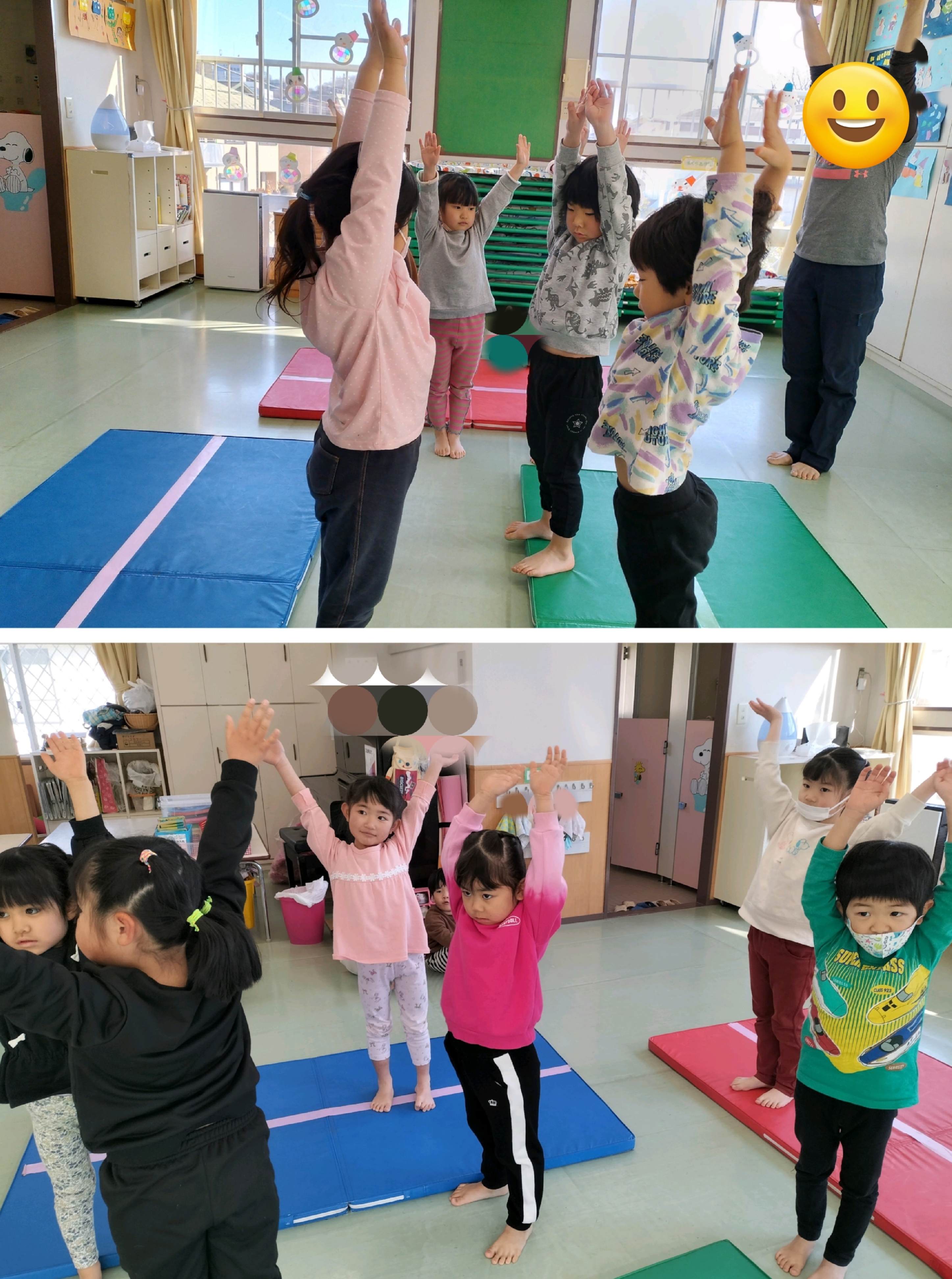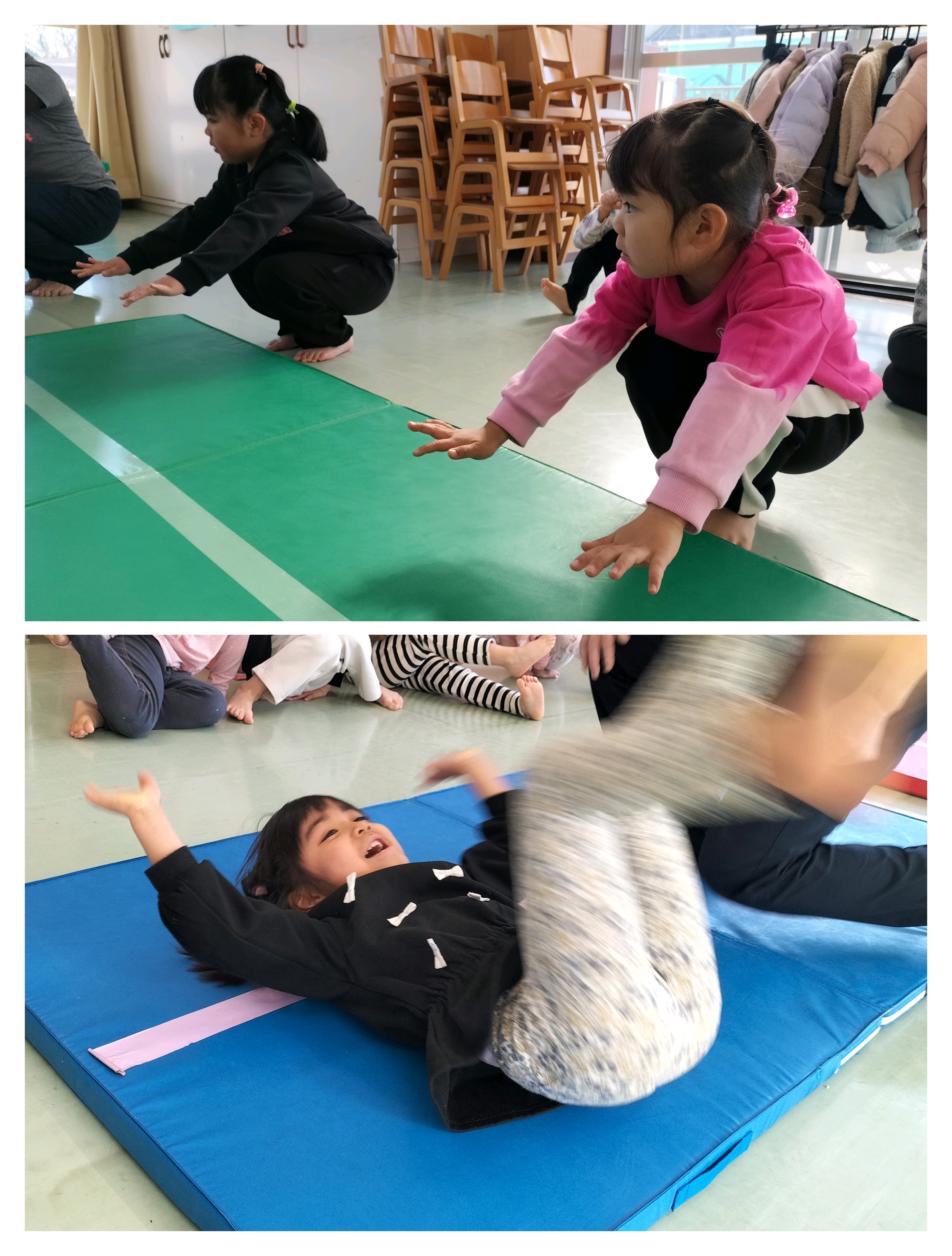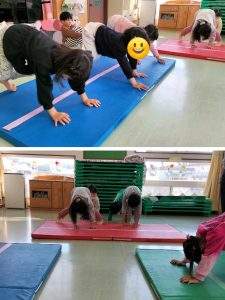 いざ前転に挑戦💪腕をしっかり伸ばすことを意識し、頭とマットをつける位置を教えてもらうと、くるんっと回れて「できた!」と喜ぶ子どもたち😊