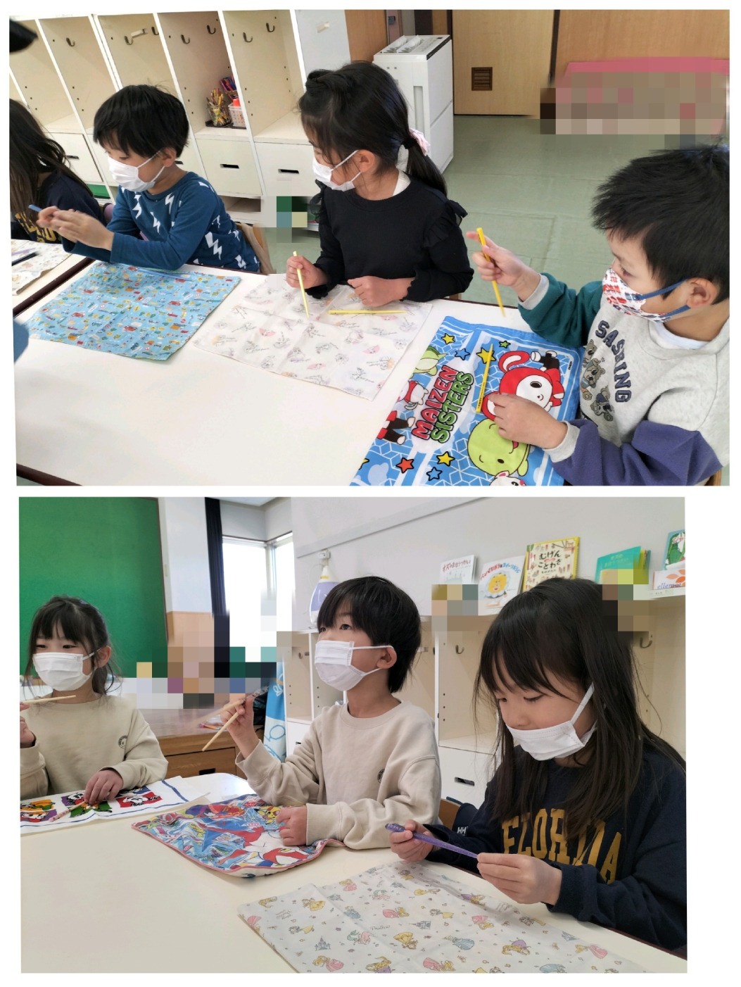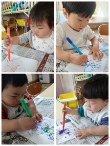 上手にペンをぎゅっと握って、ぐるぐると線を描いたり、トントンと点を打ったりして楽しむ子どもたち🌀