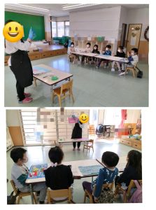 今月の食育指導は、ブロッコリーと小松菜について教えてもらいました。