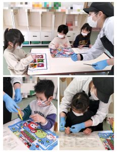 最後に霧吹きで水をかけ、じんわりと色がにじんでいく様子を、不思議そうにじっと見つめていました😊