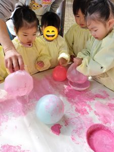 空気を入れたビニールや風船もって、ペタペタペタペタ…