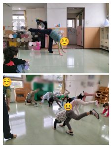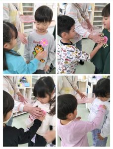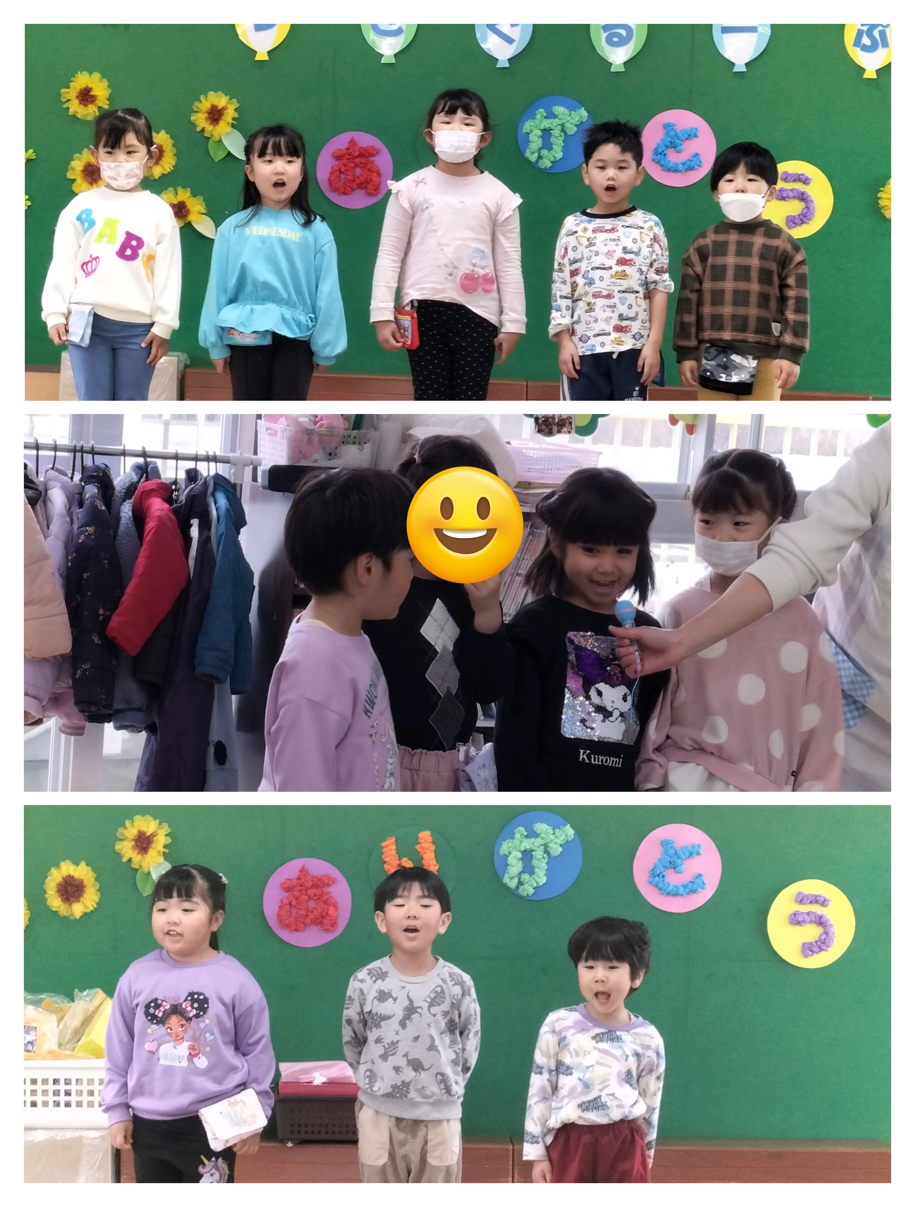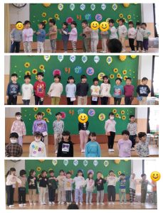 さやえんどうは、どこからどんなふうに生えてくるかをさやえんどうを触れながら教えてもらいました。前にさやむきをしたそら豆と違い、さやごと食べられる事や収穫する時期で名前が変わっていく事。さやえんどう→スナップエンドウ(さやえんどうと比べて中の豆が大きくなって厚みが出てくる)→グリンピース(さやも固くなり、豆を取り出し豆だけを食べる)どんどん生長していくけど、どの状態で食べても体を作るもととなるタンパク質が沢山含まれているそうです🫛✨
