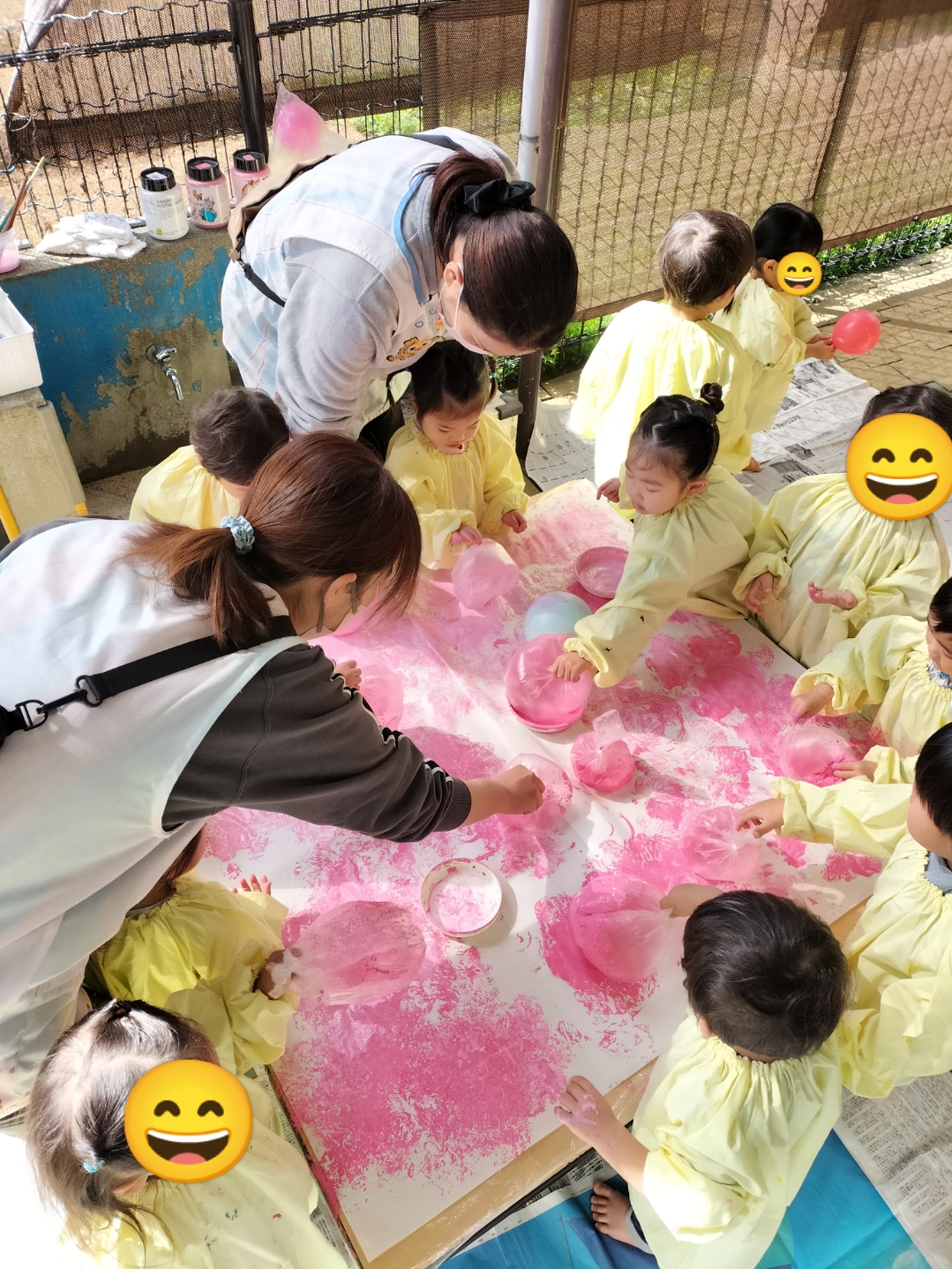大きな大きな模造紙に、ピンクや白の絵の具を使って、スタンピングしました!